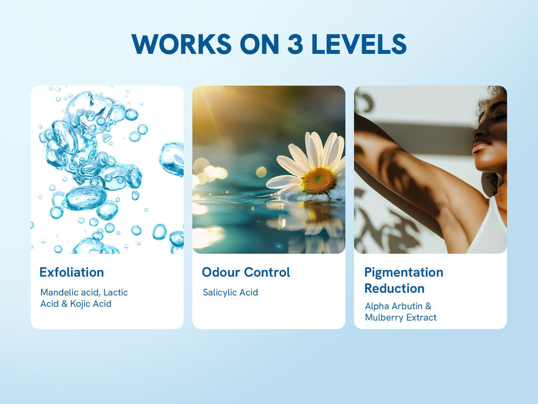 🔹 Targets Stubborn Pigmentation – 4% Lactic Acid, Alpha Arbutin & Mulberry Extract reduce underarm pigmentation